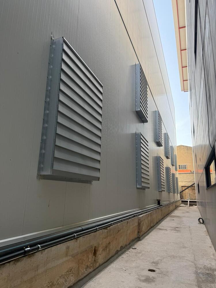 Ante la imposibilidad de delimitar depósitos mediante cortinas, se optó por una solución alternativa basada en la instalación de exutorios. Para la evacuación de humos se colocaron 9 exutorios de doble compuerta BLIND-DOOR 30/25 con zócalo integrado en la cubierta. Para garantizar el aporte de aire necesario para el correcto funcionamiento del sistema, se instalaron 11 exutorios de lamas BLIND-SLATS 20/290 en la fachada de panel.